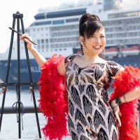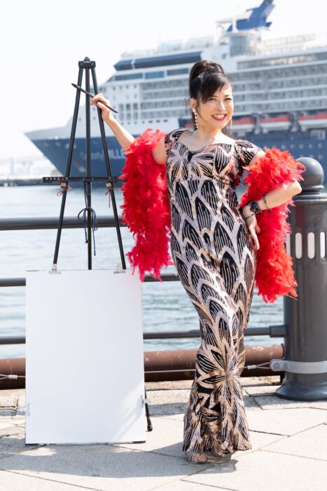 会場のお客様をモデルに、即興ソングに載せて似顔絵を描く彼女のショーは唯一無二。まさに宴会の女王です。