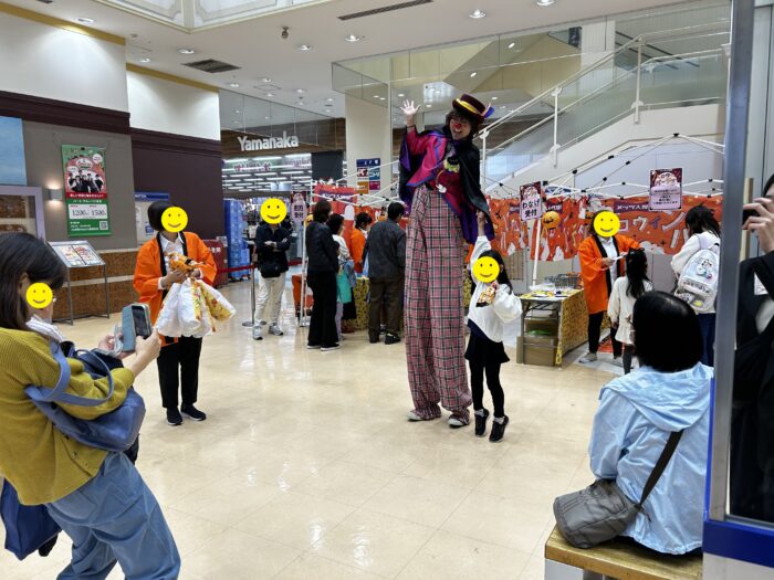 ハロウィンイベントで、子どもたちは足長クラウンに