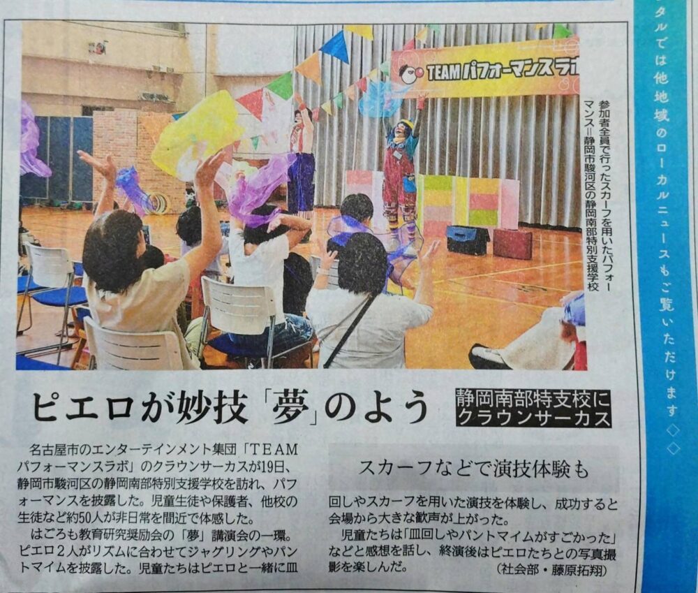 レポート HOME > レポート > 学校・舞台公演 > クラウンサーカス 支援学校 (静岡) レポート ジャンルを選ぶ。イベント幼保学校・舞台公演小福山制作バルーンフェイス&ボディペイントマジック TEAMパフォーマンスラボの活動報告です。 学校・舞台公演 2025.09.19 クラウンサーカス 支援学校 (静岡) 静岡県静岡市の特別支援学校に クラウンサーカスのココロともっきーが お邪魔させていただきました◎ みんなでスカーフを使って体験をしたり ジャグリングやコメディを楽しんでいただきました。 この日の様子を静岡新聞で 取り上げていただきました! 前へ < ブログ一覧に戻る > 次へ 学校・舞台公演2025.10.08 クラウンサーカス 学校公演 (緑区) 愛知県名古屋市緑区の小学校の芸術鑑賞会に クラウンサーカスが登場しました! クラウンサーカス… 詳しくはこちら 学校・舞台公演2025.10.07 クラウンサーカス 特別支援学校 (埼玉) 埼玉県浦和市の特別支援学校の芸術鑑賞会に クラウンサーカスが登場しました! 団長、ココロ、レ… 詳しくはこちら 学校・舞台公演2025.10.07 サーカスエコロジカル 学校公演(栃木) 栃木県宇都宮市の小学校の芸術鑑賞会に サーカスエコロジカルが登場しました。 今回は江古田博士… 詳しくはこちら 学校・舞台公演2025.10.06 クラウンサーカス 学校公演 (山形) 山形県寒河江市のホールで開催された 7校合同の芸術鑑賞会にクラウンサーカスが登場しました◎ メ… 詳しくはこちら